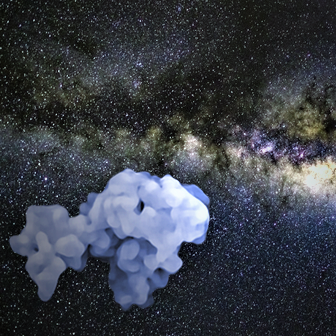 Figure 1 : Les grains de poussières cosmiques se recouvrent peu à peu d’une couche de glace dont la croissance dépend du coefficient de collage de H2O sur le grain. Au premier plan: un grain glacé de taille submicrométrique (vue d’artiste); à l’arrière-plan, une photographie de la Voie Lactée prise de la Terre, où l’on distingue clairement les nuages de poussières concentrés dans le plan galactique. Crédit : Philippe Parent, CINaM