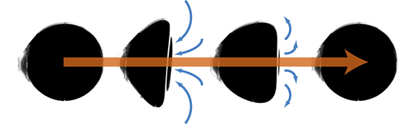 Pour cela, les chercheurs ont considéré des sphères élastiques creuses de taille centimétrique et étudié leur déformation en réaction à des variations de pression, ainsi que le mouvement de nage qui en résultait. Ces coques en élastomère ont été plongées dans des liquides de viscosité allant de 1 à 10 000 fois celle de l’eau, afin de reproduire différents régimes d’écoulement. Soumises à des surpressions allant jusqu’à une atmosphère, les coques deviennent instables et se déforment brutalement, induisant une avancée dans le liquide. Quand la pression diminue, la déformation inverse suit un autre chemin et est plus lente : le recul résultant ne vient pas annuler l’avancée. Les principaux régimes de déformation et de déplacement ont été modélisés, ce qui permet de projeter ce que serait le déplacement d’une coque de taille micrométrique qui pour nager serait soumise au champ de pression haute fréquence produit par des ultrasons.